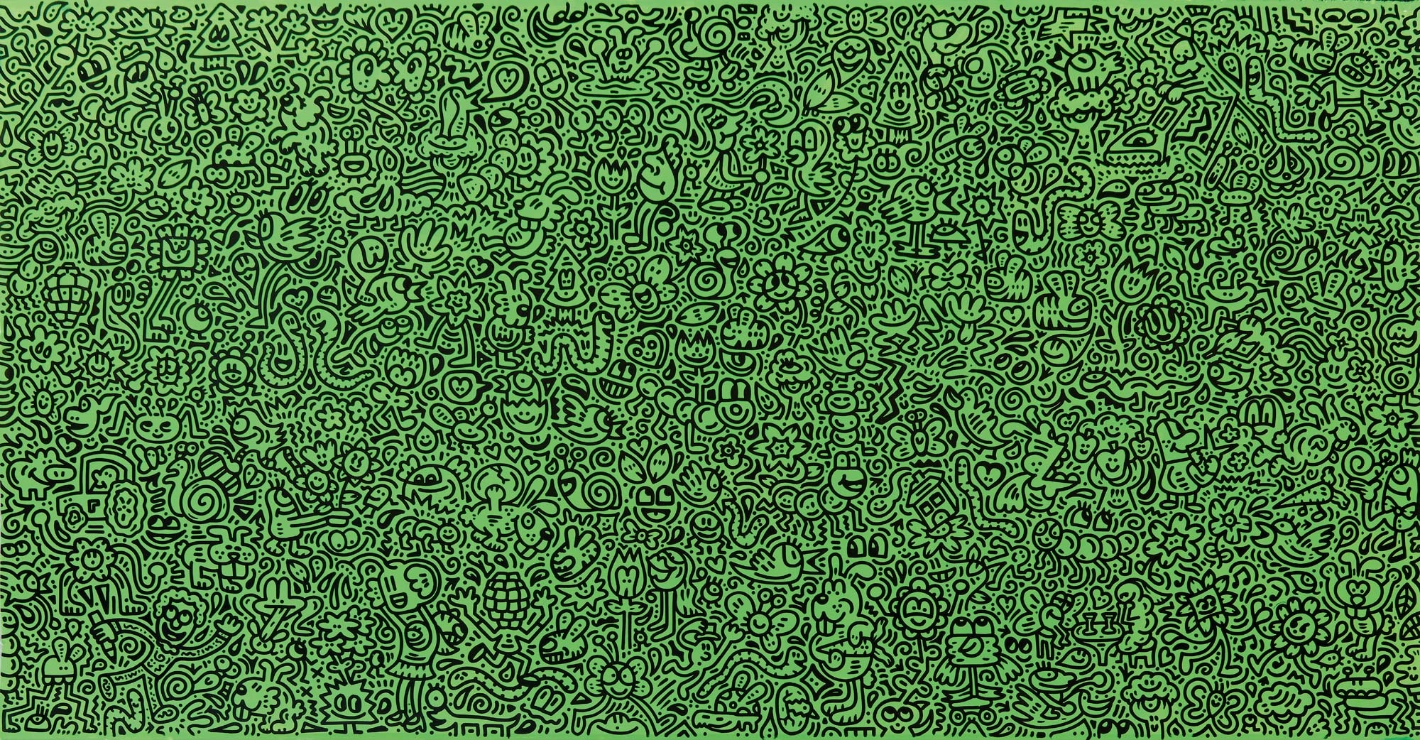 直到有天,Mr.Doodle發現家中已不足以作為他的畫布,於是開始在附近的餐廳和學校的牆上進行塗鴉。Mr.Doodle藝術家生涯的靈感與風格就來自童年時期漫畫與電玩遊戲的視覺印象,並以日積月累的練習獨創出直覺的塗鴉模式。他可以在任何地方不假思索的即席創作,且作畫速度極快,又能兼備畫作的主題結構,在密密麻麻的黑色線條細藏他所創造的不同角色,反映藝術家真性情的人生。遠望他的塗鴉,好像正欣賞一幅密集式迷宮;近看之後,你會發現這堆塗鴉是有故事性。